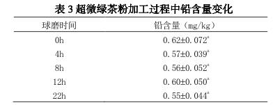 超微綠茶粉中的鉛并無(wú)顯著差異。原因?yàn)樵谇蚰ゼ庸み^(guò)程中,茶樣處于密閉空間中,且所接觸的球磨材料中鉛,所以在超微綠茶粉的加工過(guò)程中,并不會(huì)造成鉛污染。